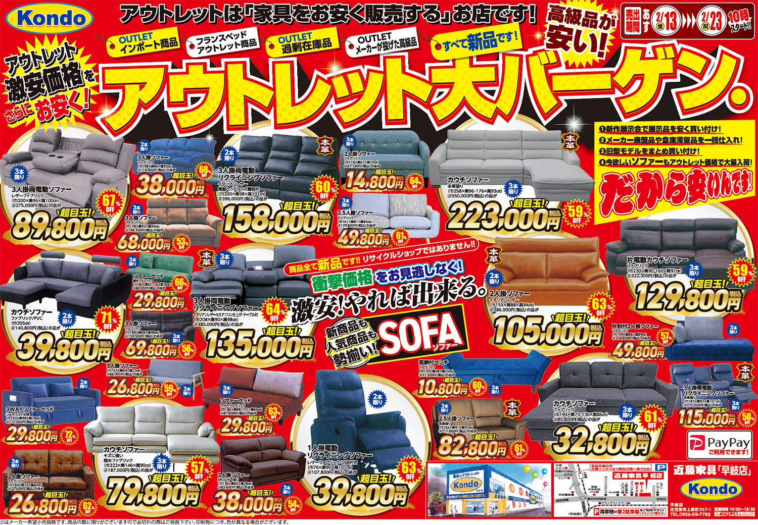 「アウトレット大バーゲン」 2月13日~2月23日 近藤家具「早岐店」にて開催!!