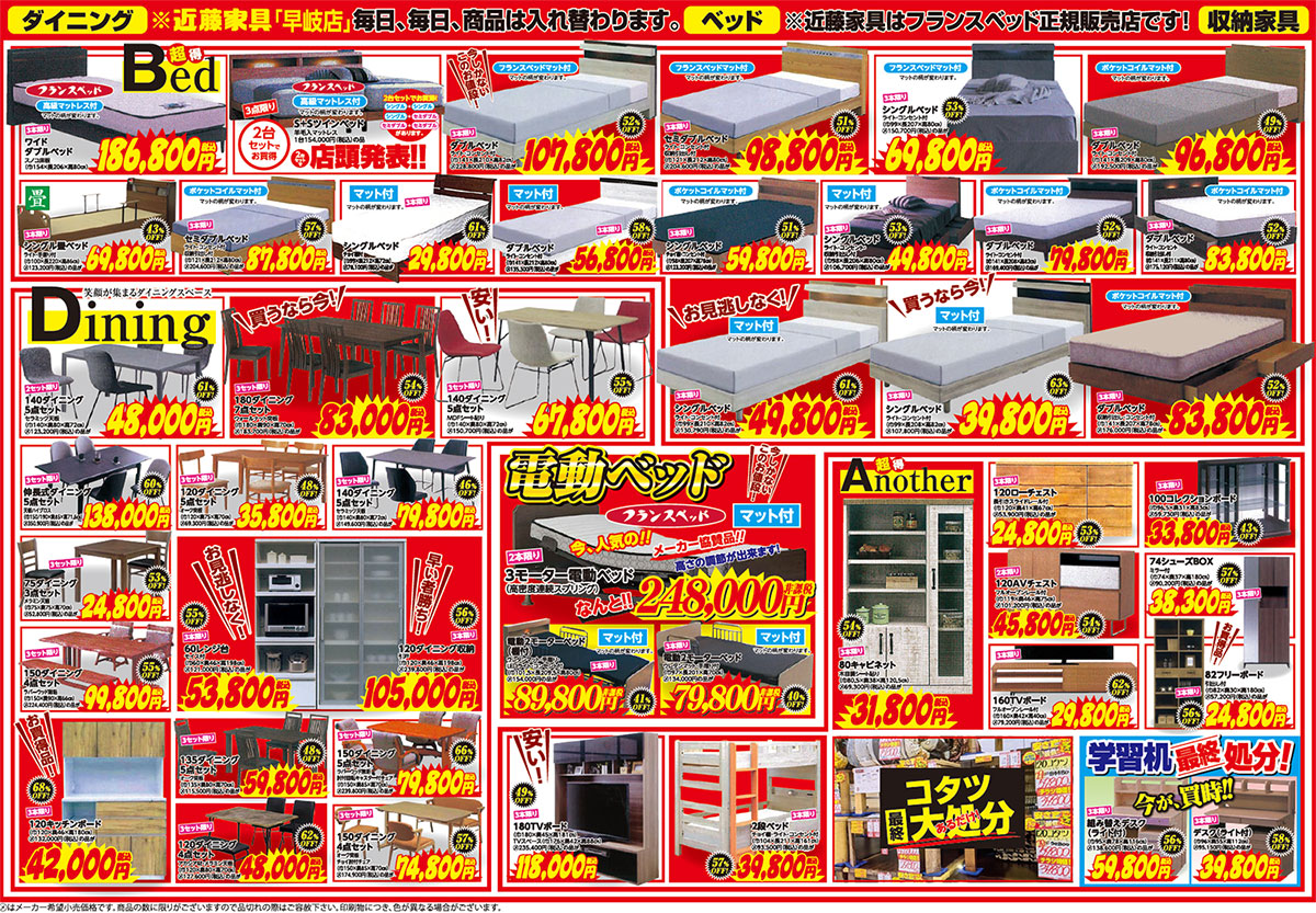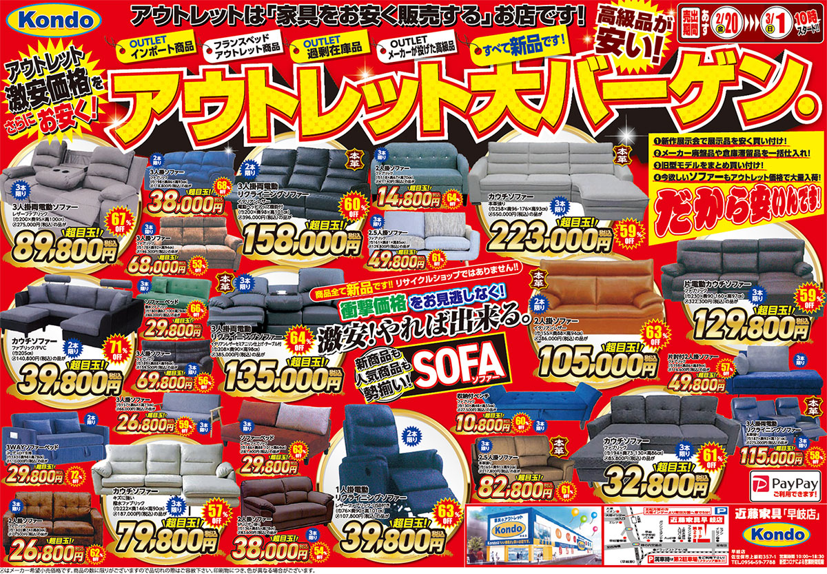 「アウトレット大バーゲン」 2月20日~3月1日 近藤家具「早岐店」にて開催!!
